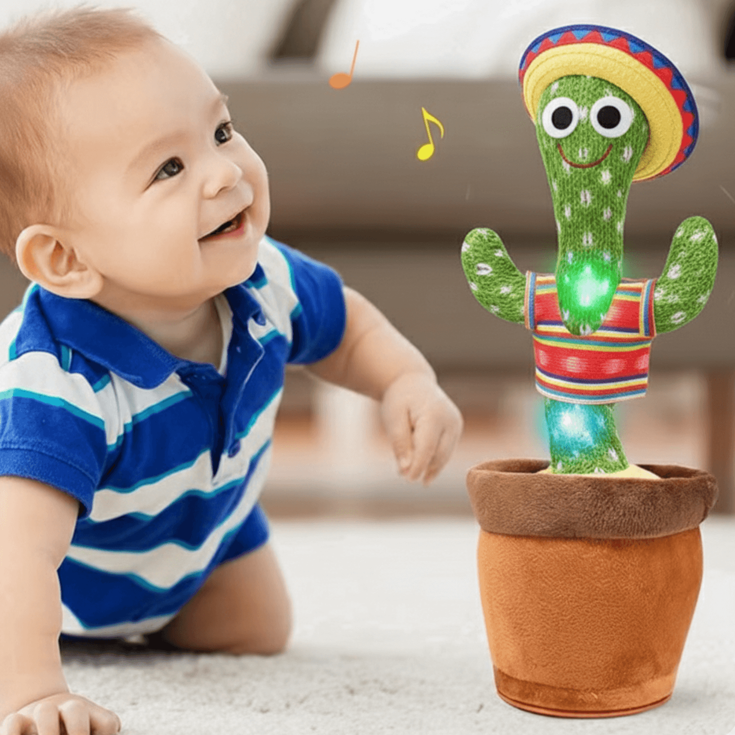 Kada ispričamo neku rečenicu, ovaj veseli kaktus ponovi za nama uz svetleće efekte i ovakvo djuskanje. Deca ga obožavaju.